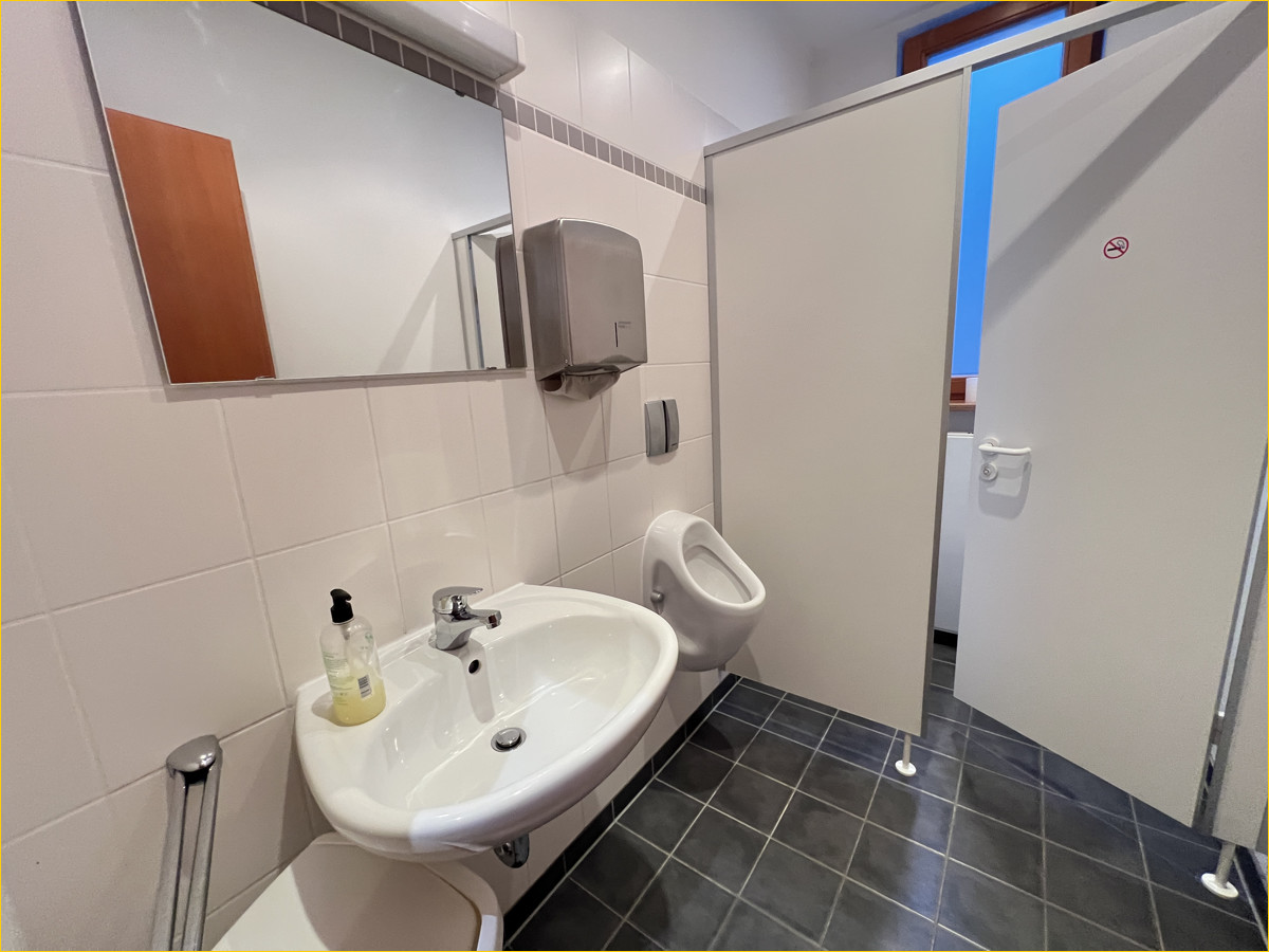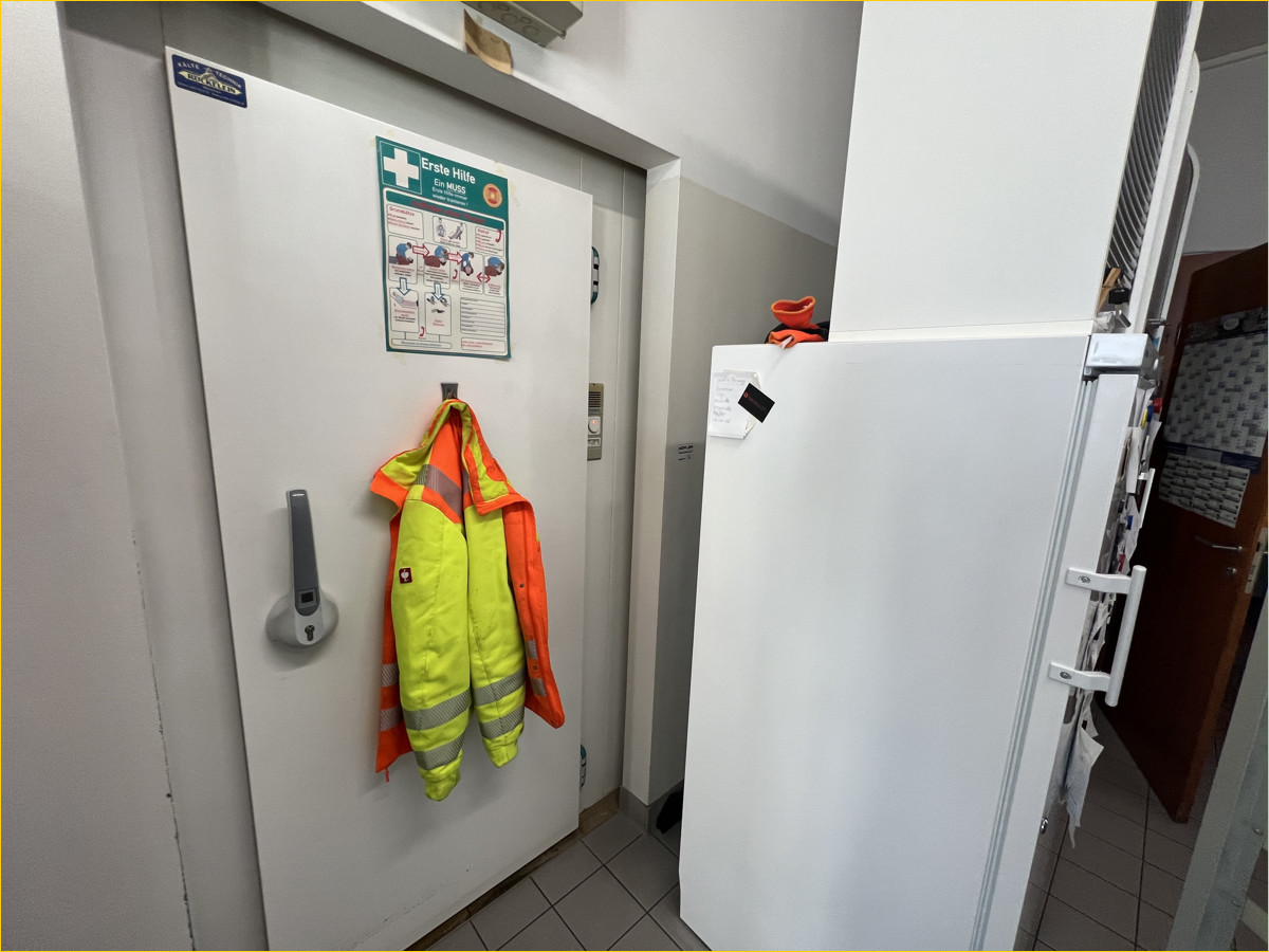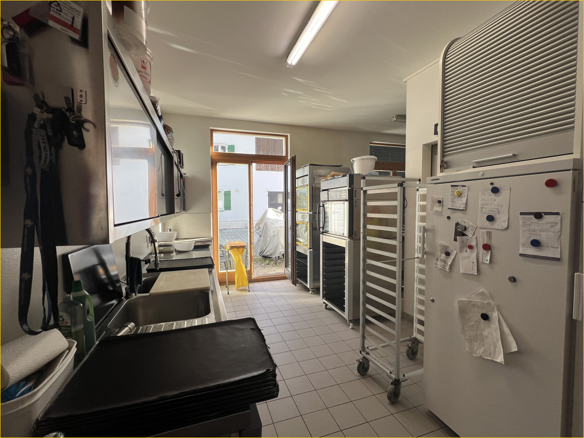 Hinter den Gasträumen mit der Theke liegt eine Küche und der Kühlraum. Hier gibt es außerdem noch ein Büro, welches zurzeit als weiterer Lagerraum genutzt wird.